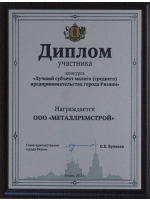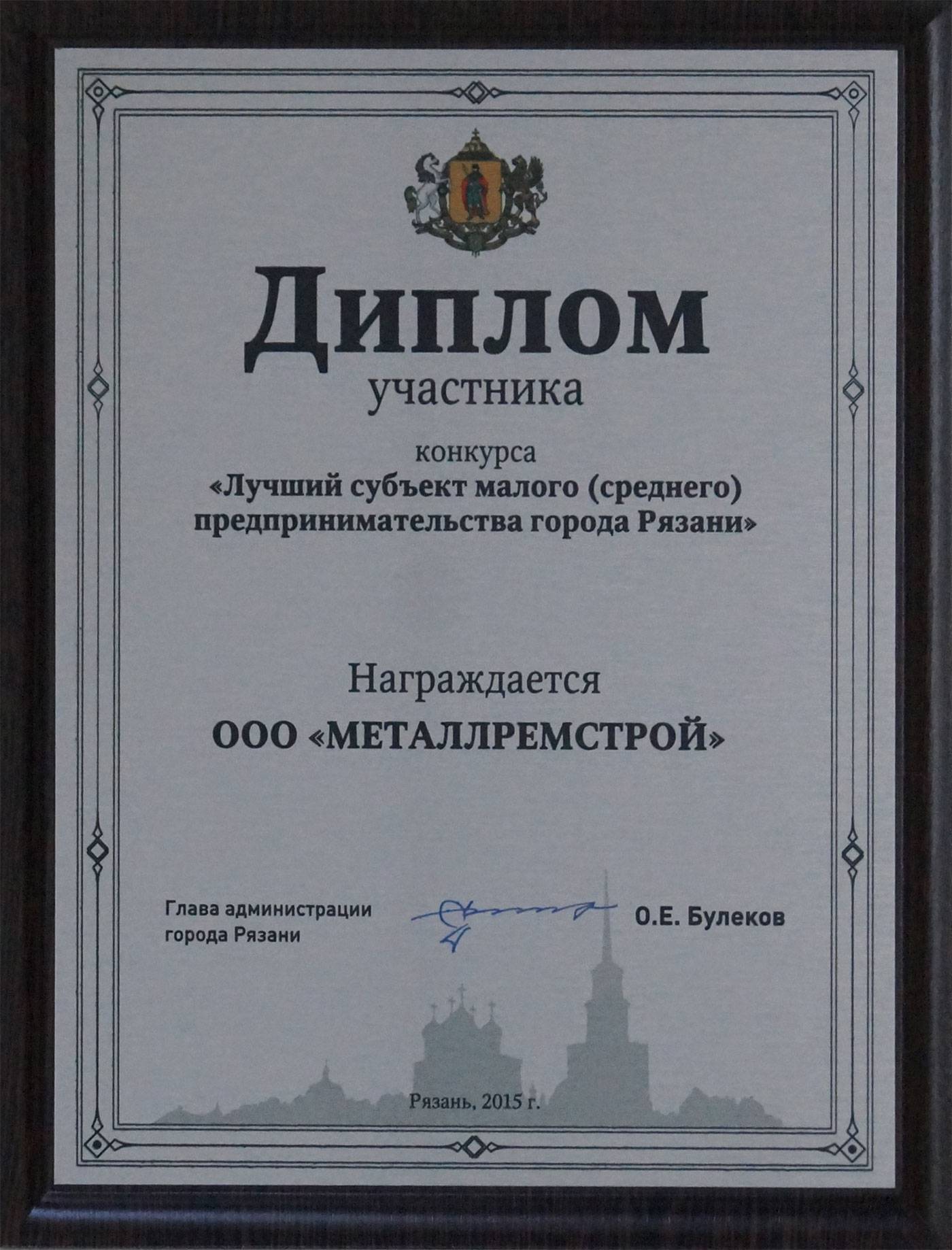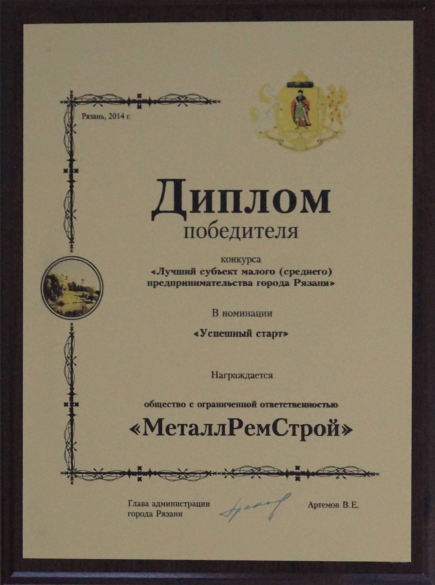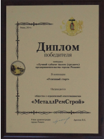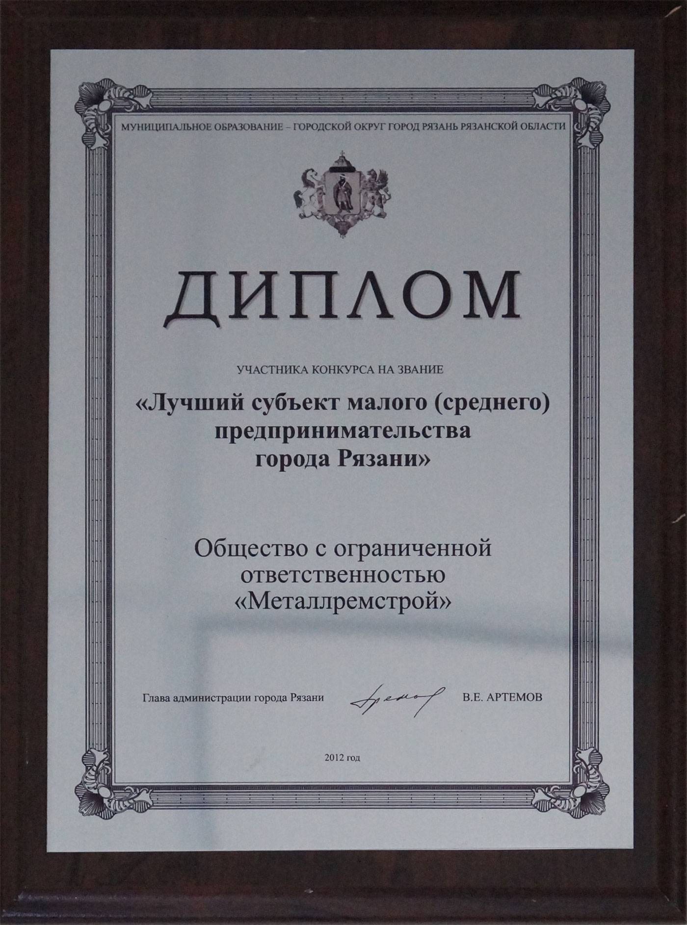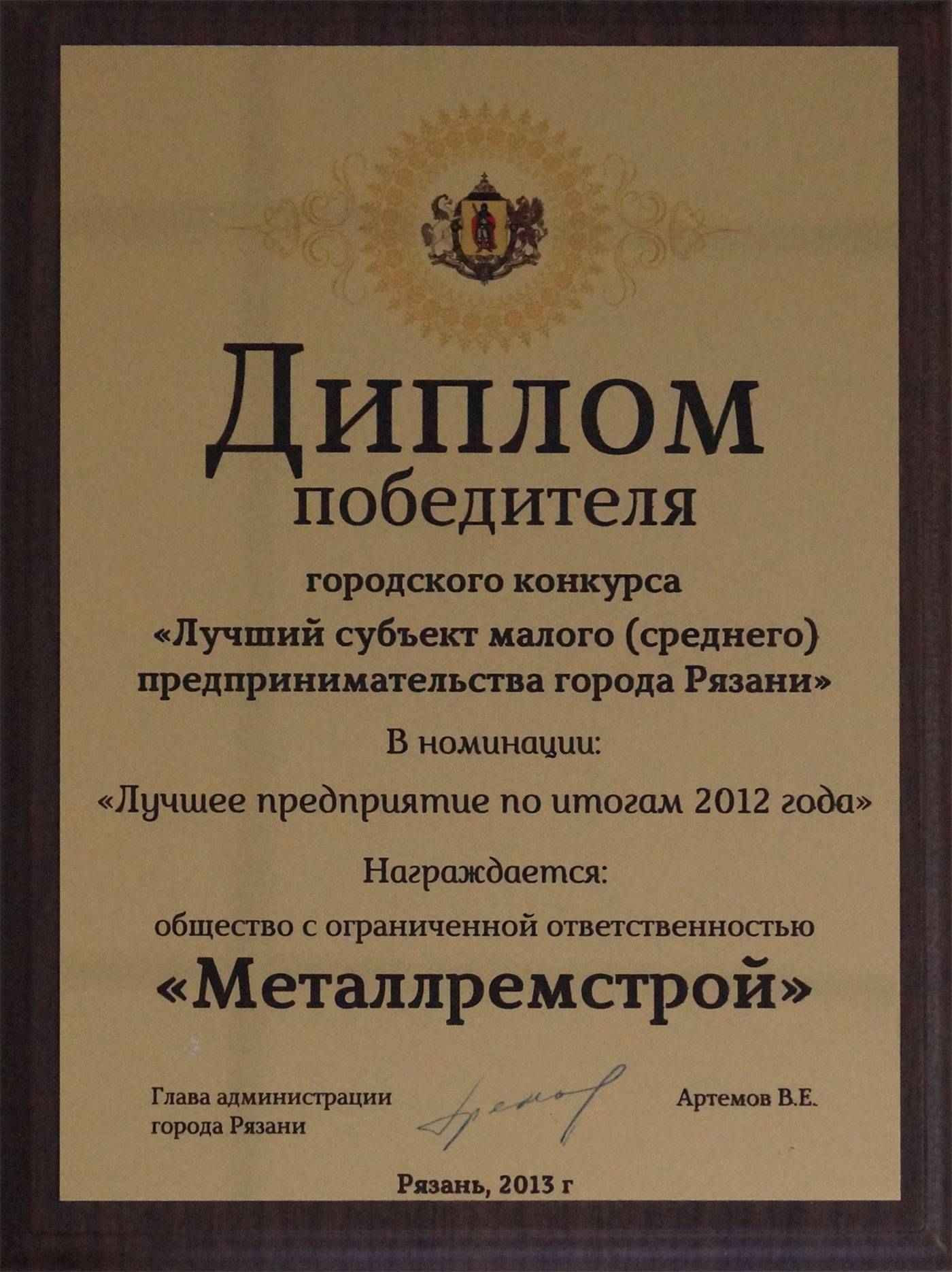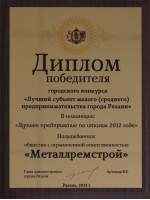ООО " ТК Металлремстрой" по результатам конкурса "Лучший субъект малого (среднего) предпринимательства города Рязани" стал одним из победителей в номинации "Лучшее предприятие по итогам 2010 года"